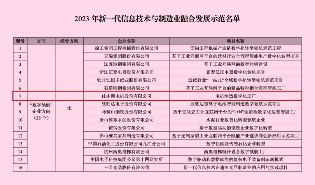 近日,工業(yè)和信息化部辦公廳公布了2023年新一代信息技術(shù)與制造業(yè)融合發(fā)展示范名單,在“數(shù)字領(lǐng)航”企業(yè)方向,哈電集團(tuán)佳電股份申報(bào)的“電機(jī)制造數(shù)字化工廠”項(xiàng)目成功入選,這是哈電集團(tuán)佳電股份在數(shù)字化轉(zhuǎn)型和科技創(chuàng)新方面獲得的又一項(xiàng)重大殊榮,也是對(duì)哈電集團(tuán)建設(shè)“數(shù)字哈電”工作成效的充分肯定。