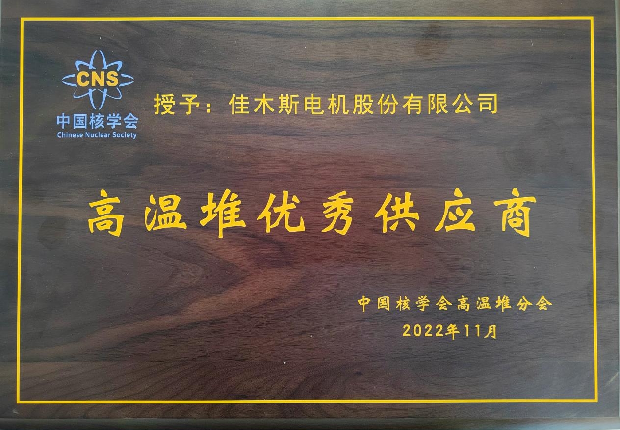 此次全球首座具有第四代先進核能系統(tǒng)特征的球床模塊式高溫氣冷堆在中國實現(xiàn)了從“實驗室”到“工程應(yīng)用”質(zhì)的飛越,其中佳電股份設(shè)計制造的主氦風(fēng)機設(shè)備在核電工程中擔(dān)任“心臟”功能,具有完全的自主知識產(chǎn)權(quán),打破了國外技術(shù)壟斷,解決了卡脖子技術(shù)難題,獲得了相關(guān)專家與業(yè)主的一致肯定與好評。為表彰在石島灣高溫氣冷堆核電站示范工程建造過程中做出突出貢獻的優(yōu)秀供應(yīng)商,繼續(xù)深化高溫堆產(chǎn)業(yè)鏈的整合,中國核學(xué)會高溫堆分會組織開展高溫堆優(yōu)秀(合格)供應(yīng)商評選活動,佳電股份獲得此項殊榮。