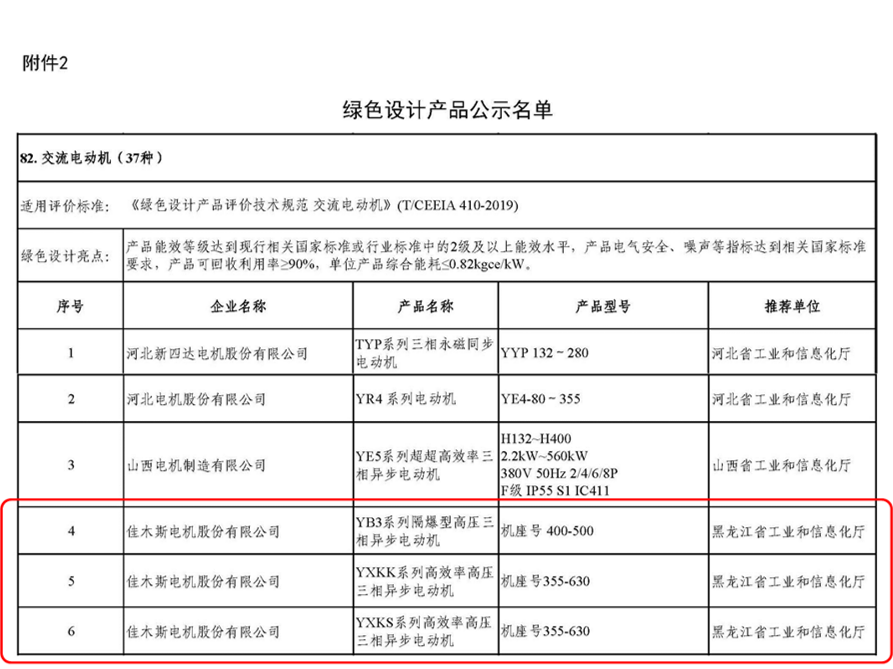 2021年12月, 3個(gè)系列高壓電機(jī)產(chǎn)品獲得國(guó)家“綠色設(shè)計(jì)產(chǎn)品”稱號(hào),IE5系列電機(jī)機(jī)企業(yè)產(chǎn)品標(biāo)準(zhǔn)獲得國(guó)家企業(yè)標(biāo)準(zhǔn)“領(lǐng)跑者”稱號(hào),該標(biāo)準(zhǔn)中規(guī)定的效率是目前國(guó)內(nèi)最高效節(jié)能隔爆型異步電動(dòng)機(jī)產(chǎn)品,效率值超過最新的國(guó)家能效標(biāo)準(zhǔn)1級(jí)指標(biāo)要求。受此認(rèn)證,佳電股份將被納入萬家用能單位的采購(gòu)?fù)扑]名單,作為綠色電動(dòng)機(jī)產(chǎn)品被鼓勵(lì)優(yōu)先采購(gòu)。