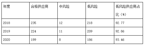 2020年,199家供應(yīng)商主要供應(yīng)商46家,購(gòu)貨金額占比90%,主要供應(yīng)商中有38家取環(huán)境管理體系認(rèn)證,32家取得能源管理體系認(rèn)證,全部供應(yīng)商取得質(zhì)量管理體系認(rèn)證。